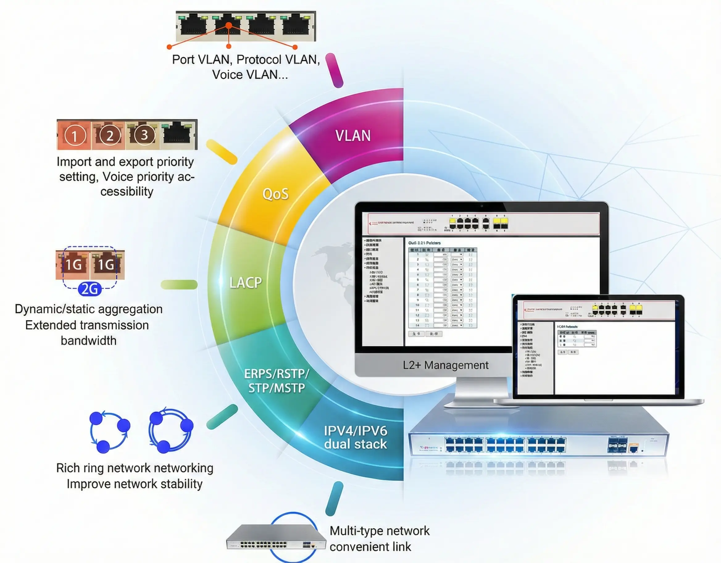 * รองรับ IPv4/IPv6, ACL/QoS, VLAN, LLDP, SNMP v1/v2/v3