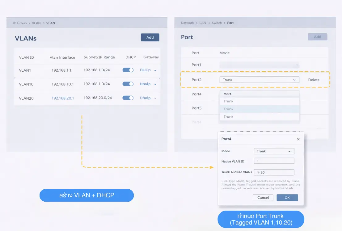 * ER7206 ต้องสร้าง VLAN Interface + DHCP และกำหนด Trunk ให้ถูกต้อง