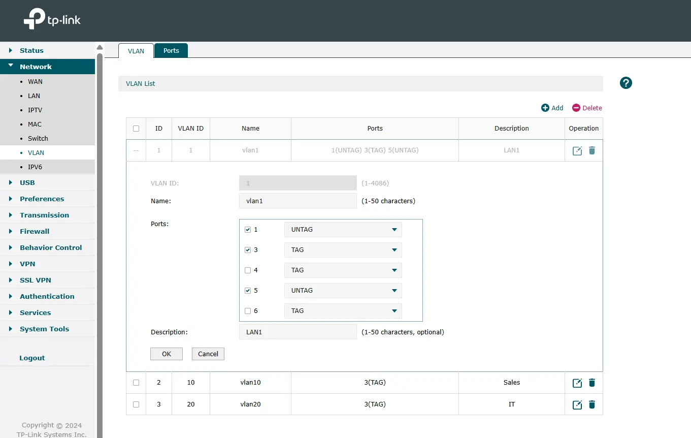 * ตรวจสอบว่า ER7206 Port3 เป็น Trunk และ VLAN10/VLAN20 เป็น TAG
