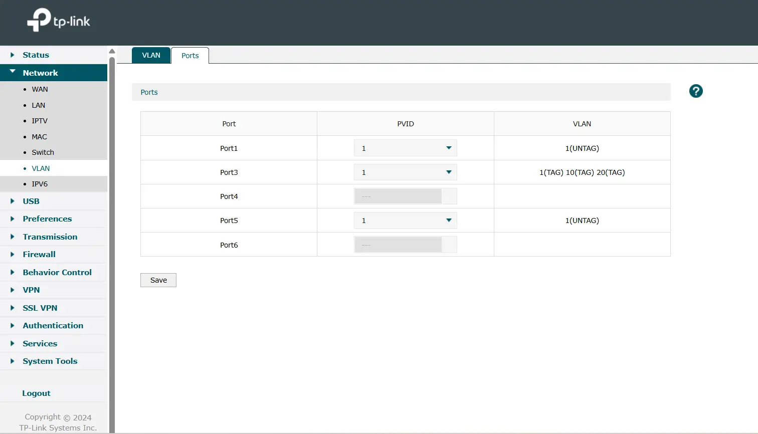 Port ที่เหลือจะ UNTAG ไว้ก็ได้ ใช้สำหรับการ Manage Router แต่ต้อง TAG VLAN ที่ใช้งานไปที่ Port3