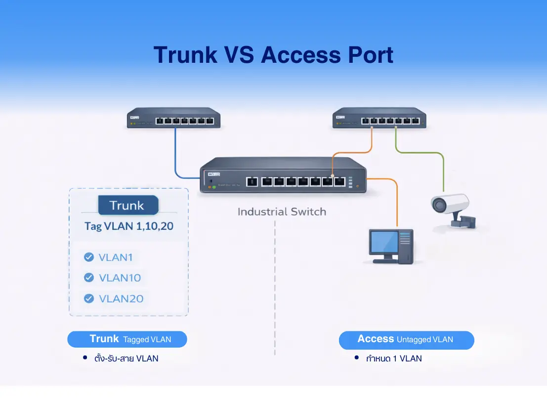 Access Port จะส่งออกแบบ “Untagged” เพื่อให้ PC ใช้งานได้ทันทีโดยไม่ต้องตั้งค่า VLAN ที่เครื่อง