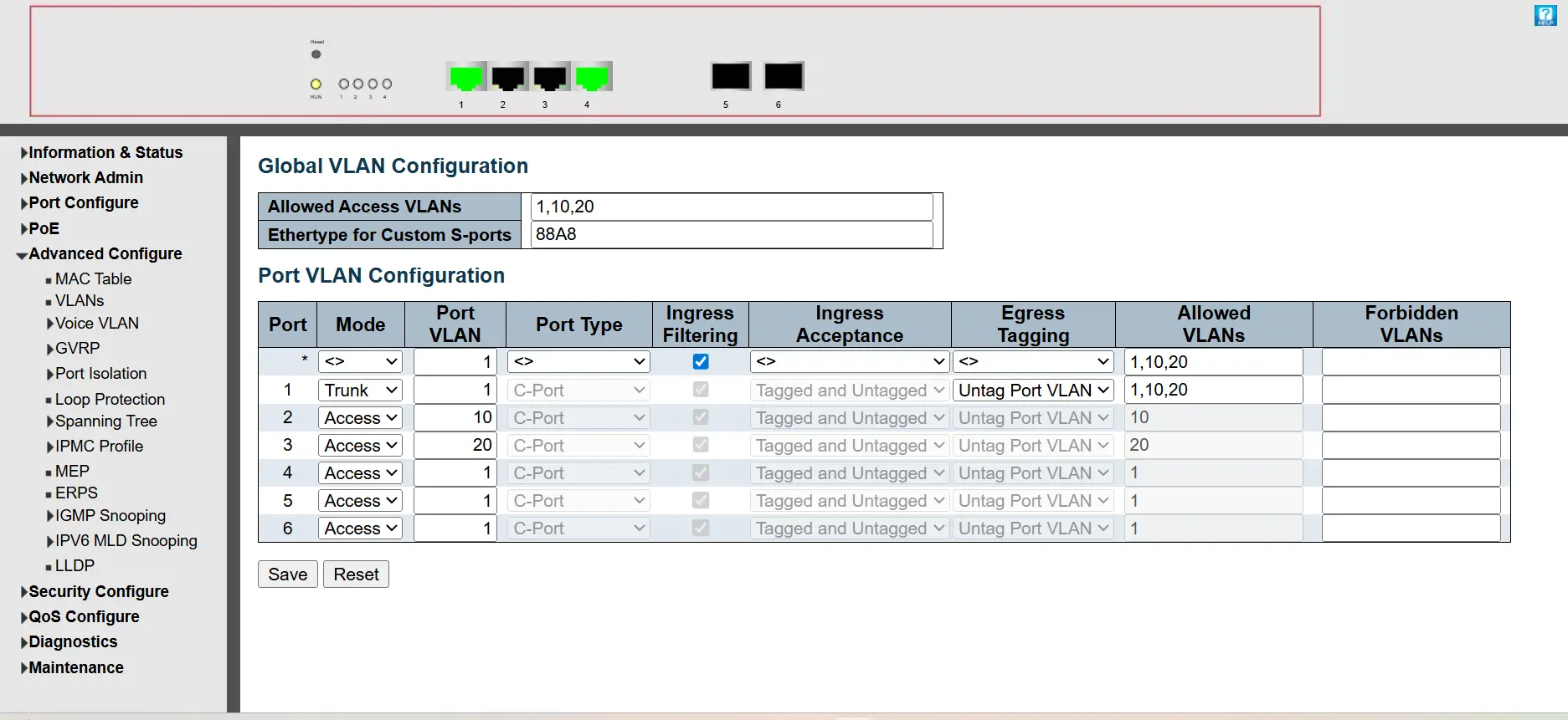 เมนู : Advanced Configure → VLANs → Port VLAN Configuration