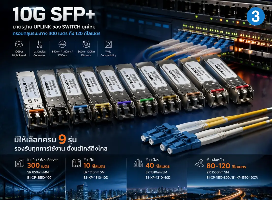 กลุ่ม 10G SFP+ เป็นกลุ่มที่ ขายดีที่สุด ทั่วโลก เพราะเป็นมาตรฐาน uplink ของ Switch ยุคใหม่แทบทุกรุ่น ใช้ใน Data Center, Server room, Campus backbone, ISP/Telco — BISMON มีให้เลือก 9 รุ่น ครอบคลุมตั้งแต่ 300m ถึง 120km