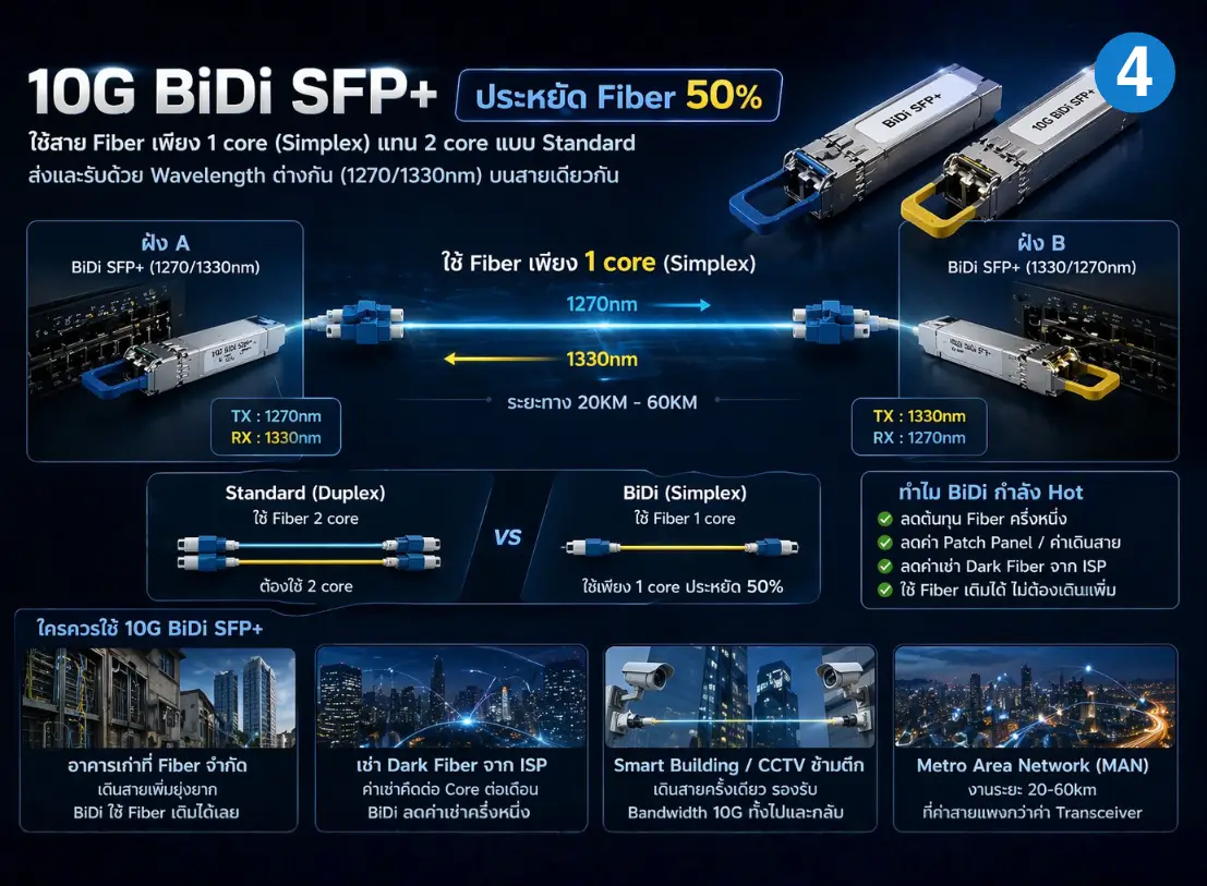 | เช่า fiber ISP (ค่าสายแพง) | กลุ่ม 2 (10G BiDi) หรือ กลุ่ม 4 (1.25G BiDi) | ใช้ fiber 1 core ประหยัดค่าเช่าครึ่งหนึ่ง |