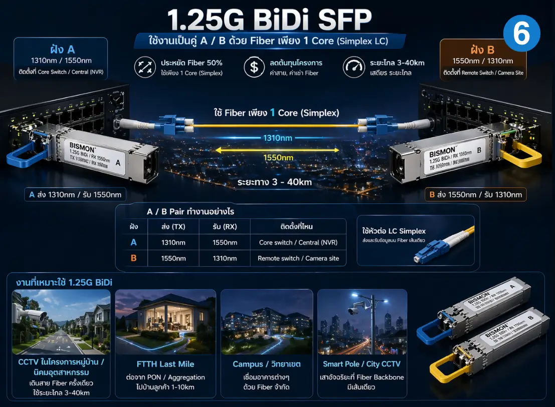 BiDi SFP 1.25G ทำงานเป็น คู่ A/B เท่านั้น — ตัว A ส่ง 1310nm/รับ 1550nm ตัว B ส่ง 1550nm/รับ 1310nm ใช้สาย fiber เพียง 1 core (Simplex LC) เหมาะกับงาน CCTV ระยะไกล หรือ FTTH ที่เดินสาย fiber จำกัด