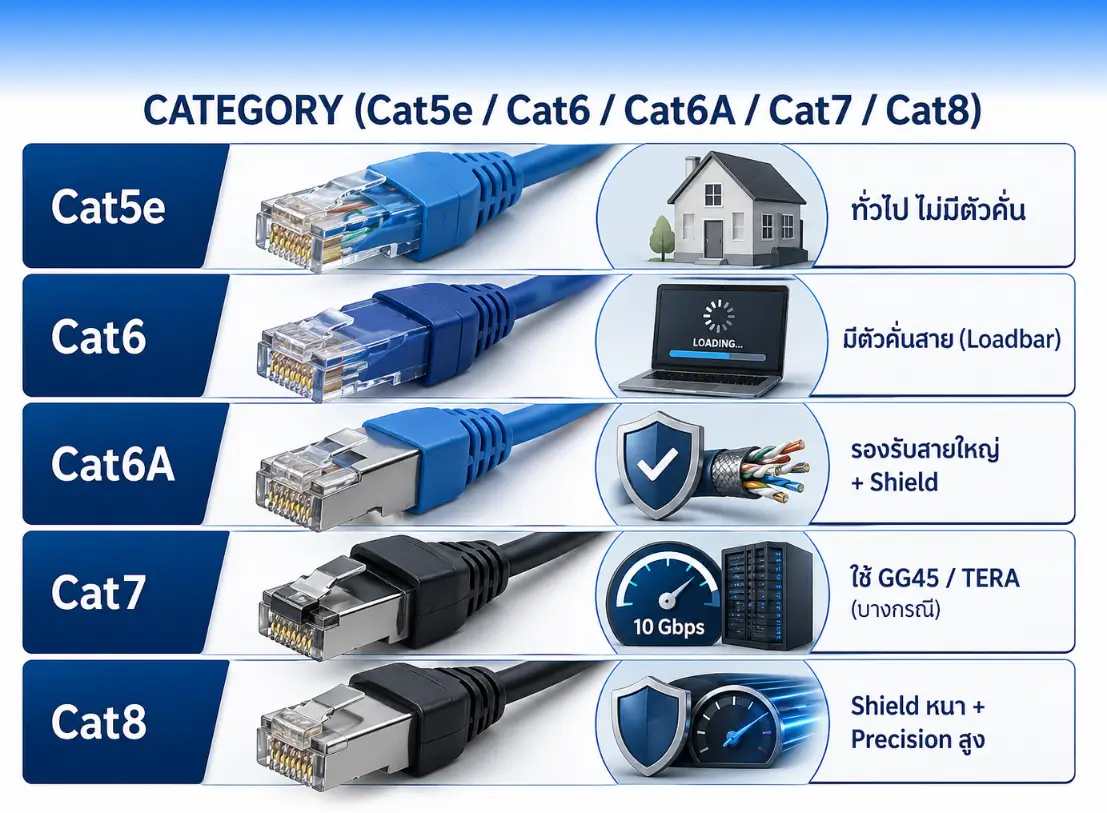 1.2 แบบตาม Category (Cat5e / Cat6 / Cat6A / Cat7 / Cat8)