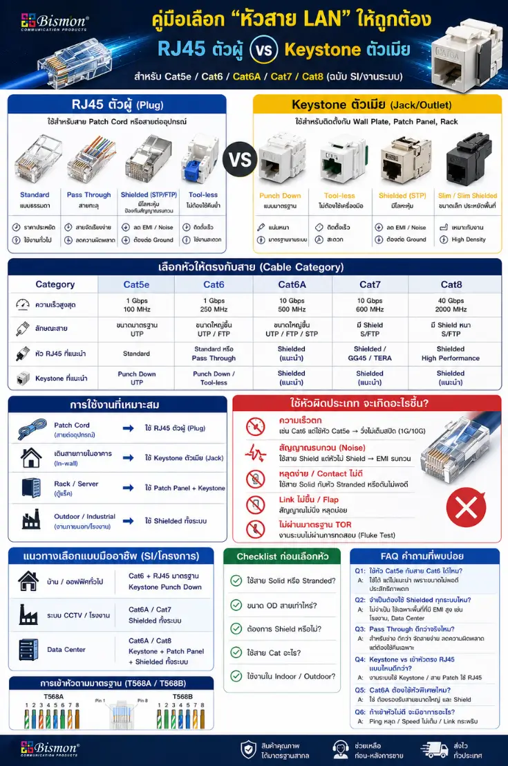 RJ45 ตัวผู้ vs Keystone ตัวเมีย สำหรับ Cat5e / Cat6 / Cat6A / Cat7 / Cat8 (ฉบับ SI/งานระบบ)