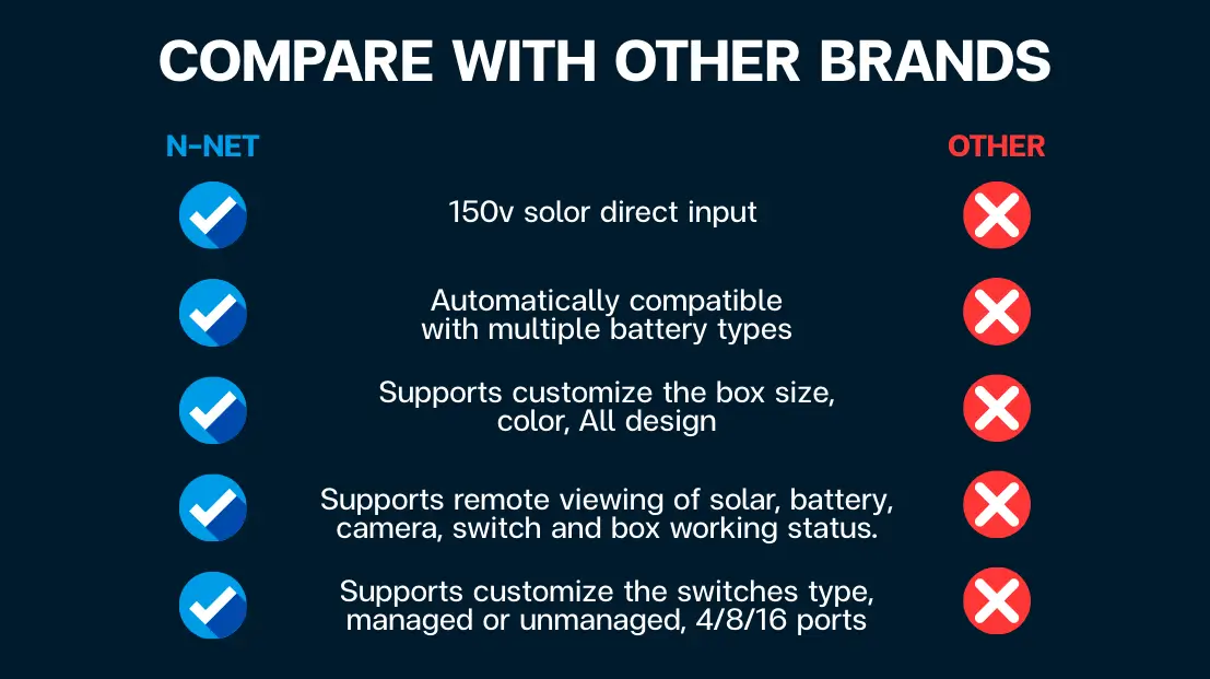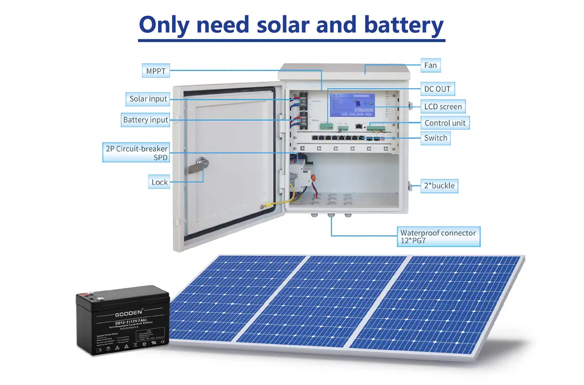 The Solar Power Smart Wall Box is an integrated outdoor solution that combines solar power management, PoE switching, and intelligent control in one compact enclosure.