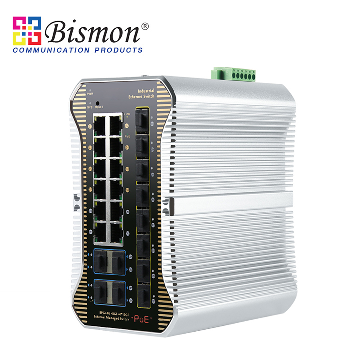 The B1-IPS36248PFM is a 10G uplink managed industrial PoE switch independently developed by BISMON. It has 12*10/100/1000Base-T adaptive RJ45 ports and 8*100/1000Base-X SFP fiber ports and 4*1/10G uplink SFP+ fiber ports. Port 1-8 can support IEEE 802.3 af/at PoE standard and the single-port PoE power up to 30W. As a PoE power supply device, it can automatically detect and recognize power-receiving devices that meet the standard and supply power through the network cable. It can supply power to PoE terminal equipment such as wireless AP, IP camera, VoIP, and industrial sensors through the network cable. It also meets the network environment that needs a high-density PoE power supply. It is suitable for intelligent transportation, rail transit, power industry, mining, petroleum, and industrial scenes such as shipping, metallurgy, and green energy construction forming a cost-effective, stable, and reliable communication network.