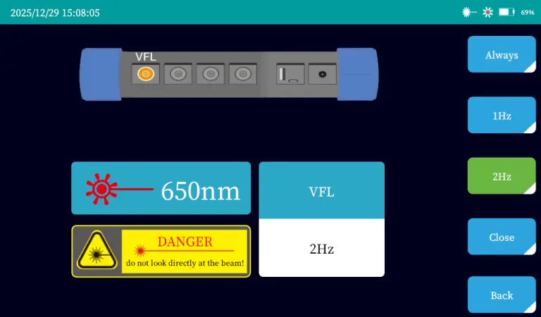 Supports continuous 1 Hz/ 2 Hz visible red light for rapid fiber fault location.