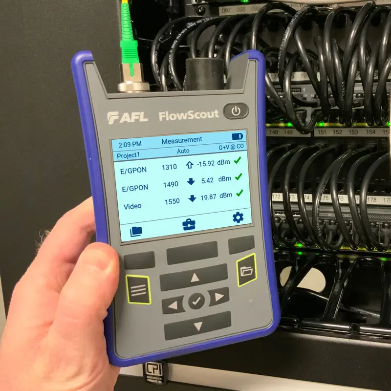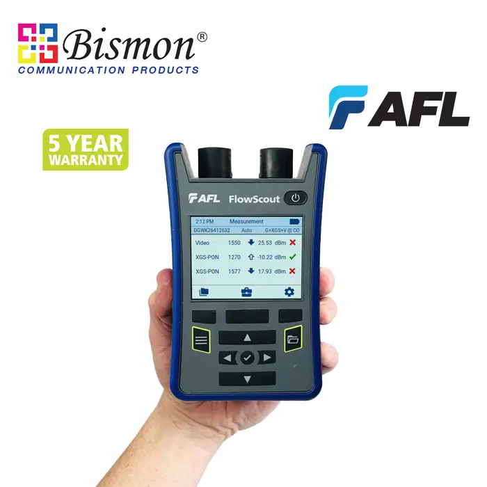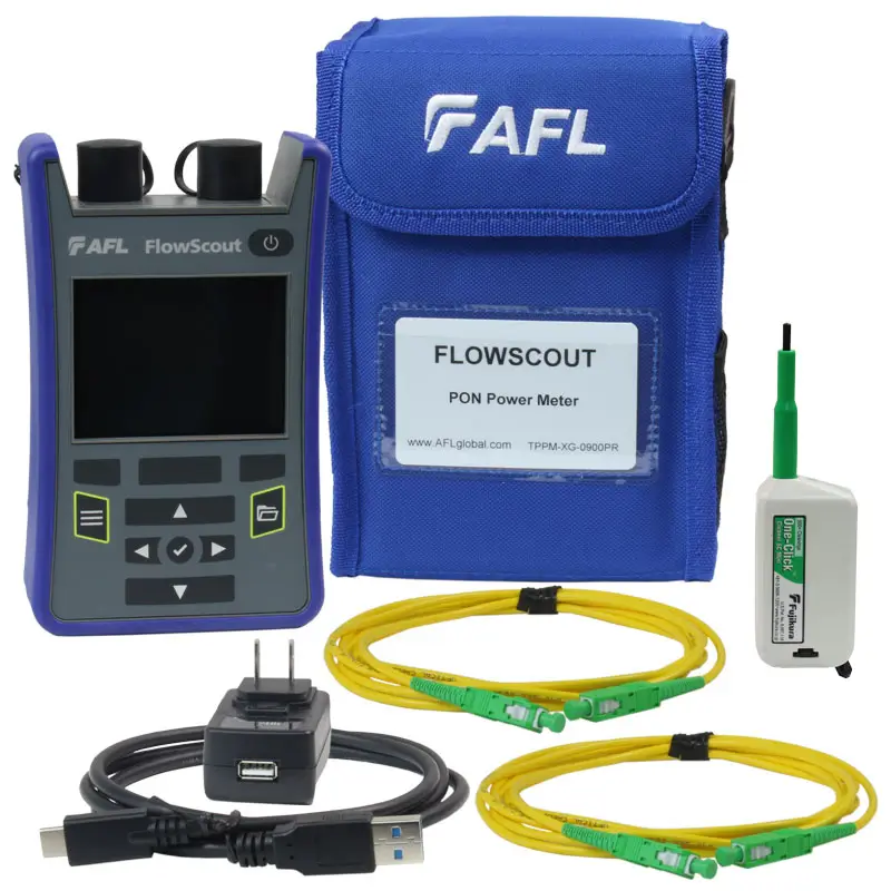 AFL’s FlowScout Through-Mode PON Power Meter identifies, measures, and qualifies both downstream and upstream signal levels in FTTx PON networks. It is perfect for technicians responsible for activating and maintaining networks carrying a mix of GPON/EPON, video, and next gen PON (XG/XGS-PON, 10GEPON) wavelengths.