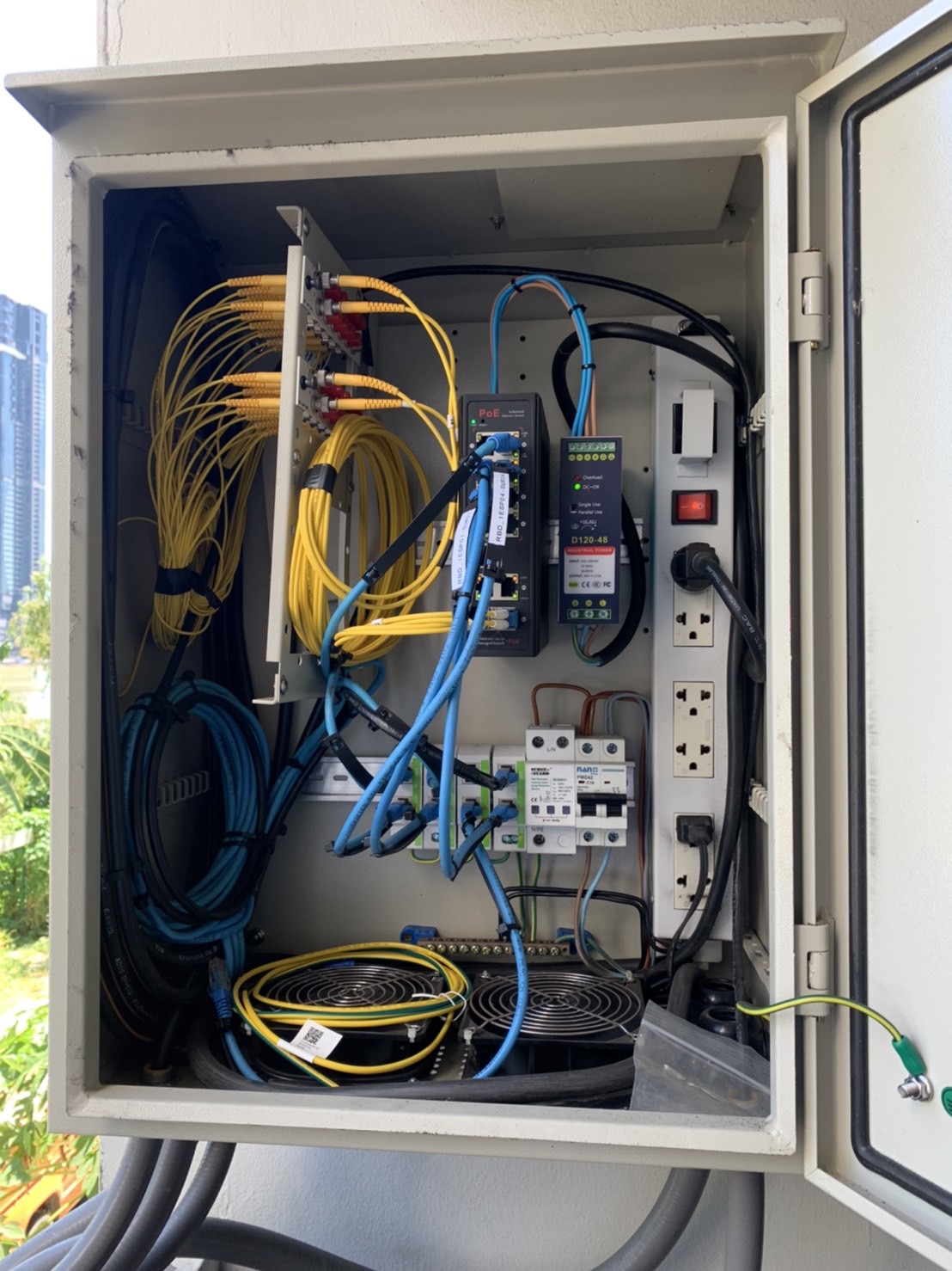 ตู้สำหรับมืออาชีพด้านระบบกล้องวงจรปิดและระบบคอมพิวเตอร์เทเลคอมเท่านั้น สามารถแขวนได้ทั้ง ผนังปูน, เสากลม และ เสาไฟฟ้า - Provided CNC foam gasket for protection waterproof, humidity, insect - Double folded gutter at door frame to increase rigidity and prevents water from entering while door is opened - 4 welded studs for fixing mounting plate and service equipment inside - Use for CCTV & IP Camera eta. - Made from EG(Electro Galvanized) Steel material Double Layer layer - The color of cabinet Surface finished cabinet with epoxy-polyester coating, Electrostatic powder system - Can use FAN 2x4" (4"x4") - Can use UPS MAX:1100VA. - Max. Capacity 96 Core Fiber optic ST/SC/FC/LC connector - Size: 600mmx440x245mm (HighxWidthxDepth)